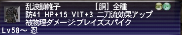 こんばんは_(._.)_ リンバスリーダーのうっかりヒュムから声をかけられ テメ北いってきました。 ついこの間に忍素材1個目は入手して篭手のうち直しが終わってたわけですが 今回は胴を打ち直すべく北一層、忍赤で突入しまして無事に一層の箱から出てまいりました。 初めて一層で見た気がしますこの素材。 忍者はほんと人気商品で外販でも40~60くらいの間で取引される代物です。 まぁ、それだけ打ち直しすると大きく変わるものなんですけどね。 胴はショックスパイクに変わるのとDEXが+5されるんですが後者の効果が 基本大きいですね。 命中が+2されるんで通常時の命中確保の変わりになるわけです。 足で歩行速度延長も捨てがたいですが、団体行動における際に突出する原因にもなるんで 胴にしようと思います。 まぁ、これが これになるわけですね。 というわけで今週のうちに預けようと思います。 やあ、やはりもつべきはフレです。 しばらく足を向けて寝れませn